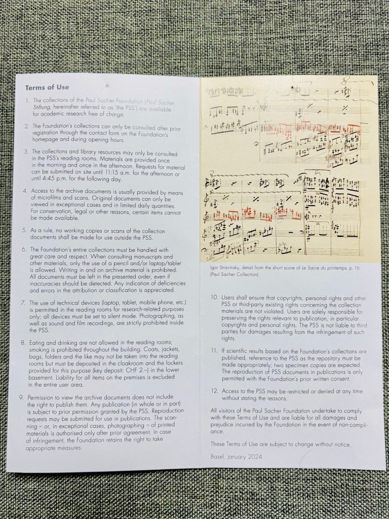 This is the foundation’s brochure, which we received upon arrival. Inside, you can read the terms of use for the building’s materials, with a strong emphasis on the prohibition of scanning, copying, or photographing them. In the top right corner, there is a picture of Stravinsky’s manuscript of his renowned Le Sacre du Printemps, p. 16 (The Rite of Spring).